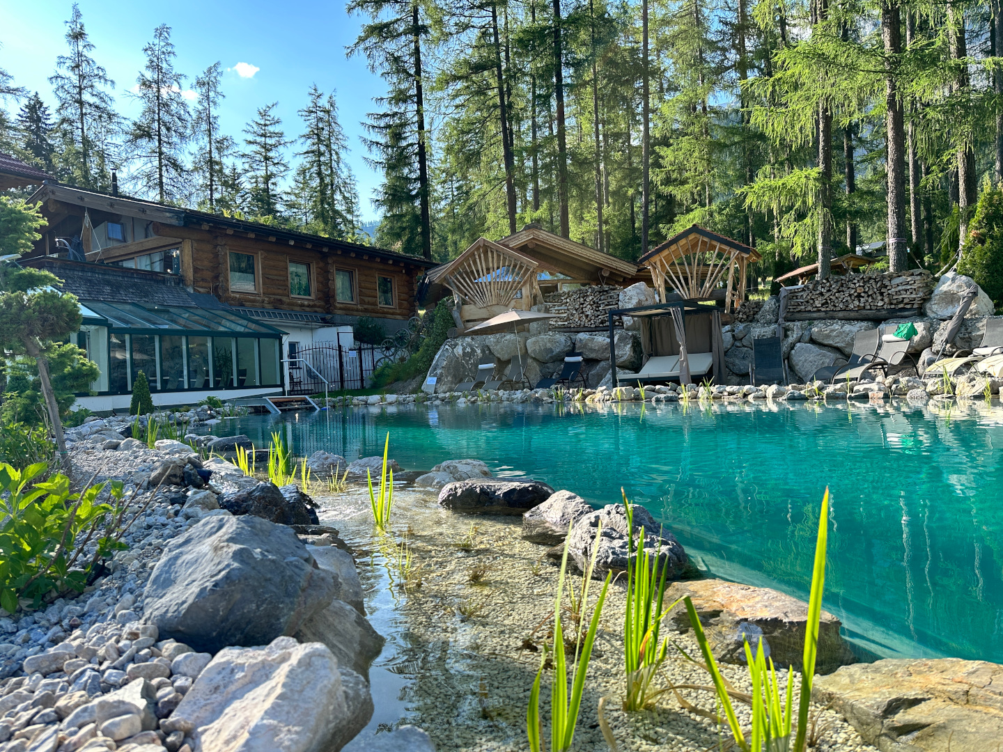 Naturschwimmteich und Saunabereich mit Panoramablick.