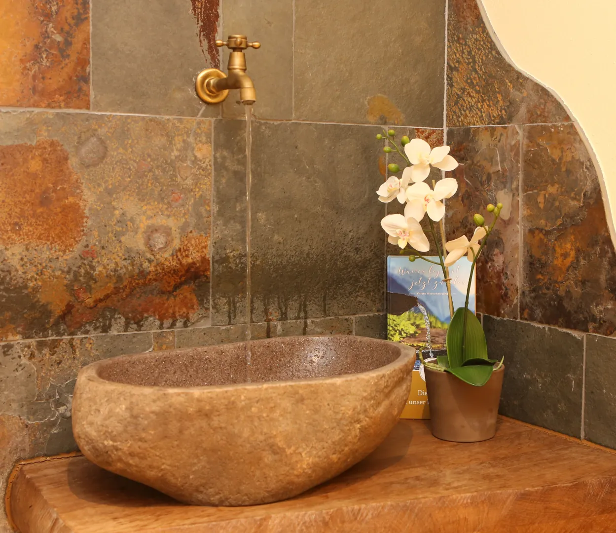 - Dampfsauna (50 bis 55 °C) mit Schieferstein und Naturstein